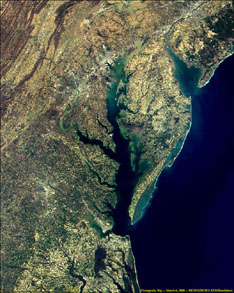 Chesapeake Bay aerial photo (center), showing the DelMarVa peninsula with Delaware Bay on the far side (top right). NASA image taken by MODIS.